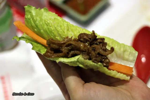 把烤牛肉放在生菜上加上紅蘿蔔和小黃瓜放上一點韓式辣醬
