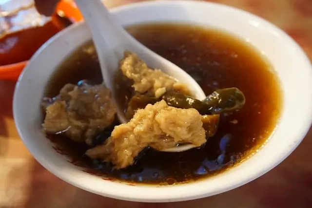 清湯瓜仔肉(55)我以前在念書的時候 學校宿舍有供餐 我第一次喝到瓜仔湯就是在那時候 當然對他的印象就是醬瓜罐頭丟下去煮 就不喜歡 其實來之前我對他的湯也是不抱希望的 畢竟第一次接觸的印象太差 但是沒想到的是 他是瓜仔湯也太好喝了吧 小王瓜子湯很甘醇啊 完全把我對瓜仔湯的壞印象完全打破 而且這樣的甘醇 配他魯肉飯更是完美 可以把嘴把的味道重新整理一次 再趴一口魯肉飯 呼~~真的是超爽的 而湯裡面的醬瓜不會軟軟爛爛的 還是保持他的脆度 帶著一點甘甜味 裡面的肉羹的口感也很好