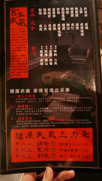 每間店以武藏麵屋為名,後面會接上虎嘯、神山等店名,據說每間店菜單會有些許變化。