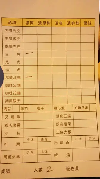 拉麵湯頭分為 白虎-白湯 / 黑虎 - 白湯加入墨魚汁及黑油等秘方/ 赤虎-白湯搭配韓國辣椒和自製辣豆瓣