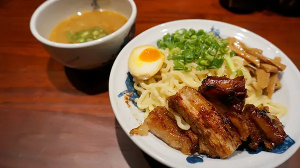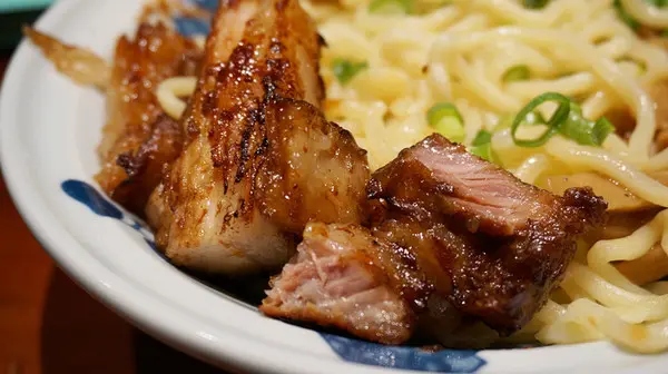 拉麵煮好後經過冰鎮麵體很冰涼,沾熱濃湯汁食用很適合夏天,