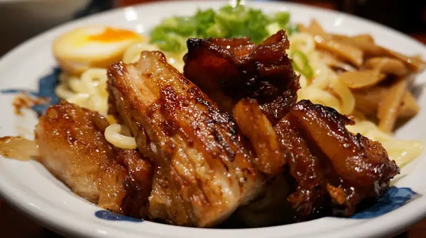 油亮亮叉燒滷後大火煎表皮微微焦香氣濃郁,肉質肥嫩Q彈入口即化,堪稱一絕 (讚)。