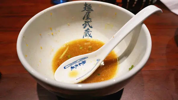 麵屋武藏使用自製粗拉麵,因此麵體沾附醬汁食用如果不喝湯就不會覺得過鹹,