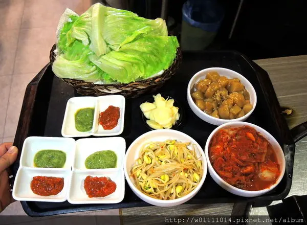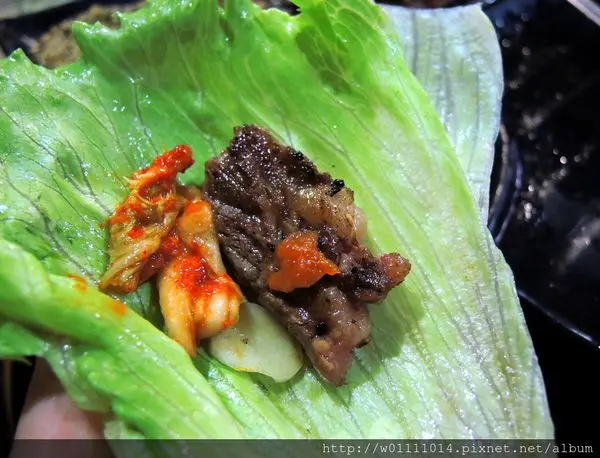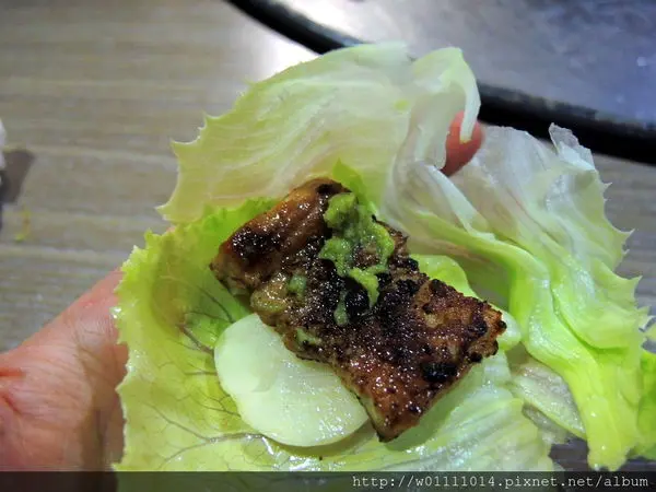 也可以搭配生菜一起吃,放上韓式泡菜、蒜片和一點韓國味噌醬一起吃還不錯,很清爽
