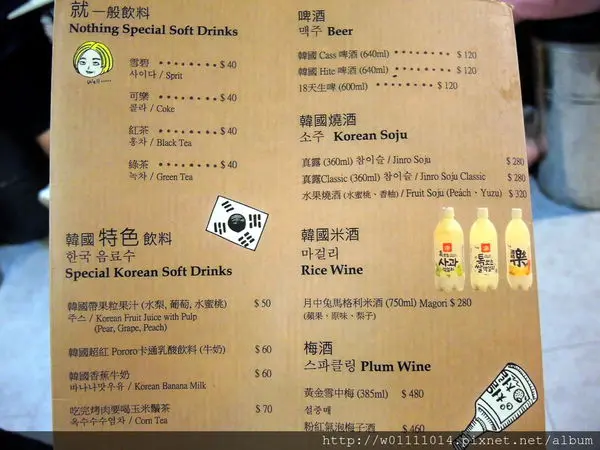 一般飲料、韓國特色飲料、啤酒、韓國燒酒、韓國米酒和梅酒等~種類挺多的