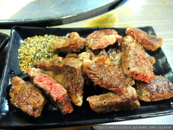 吃起來肉質挺軟嫩的~烤約6.7分熟,中間還帶點粉嫩色澤~~醃製的醬汁也不會太鹹
