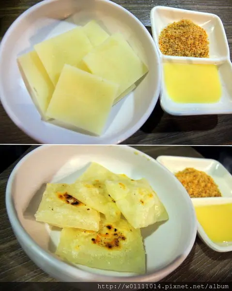 本身切成厚條狀,但燒烤的時候~人員會把它剪成小塊狀方便入口
