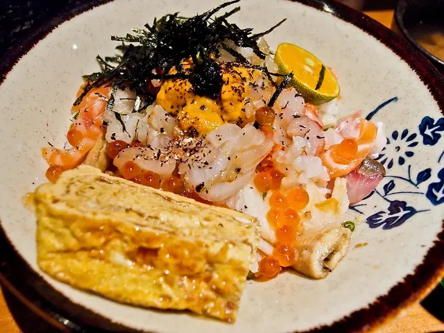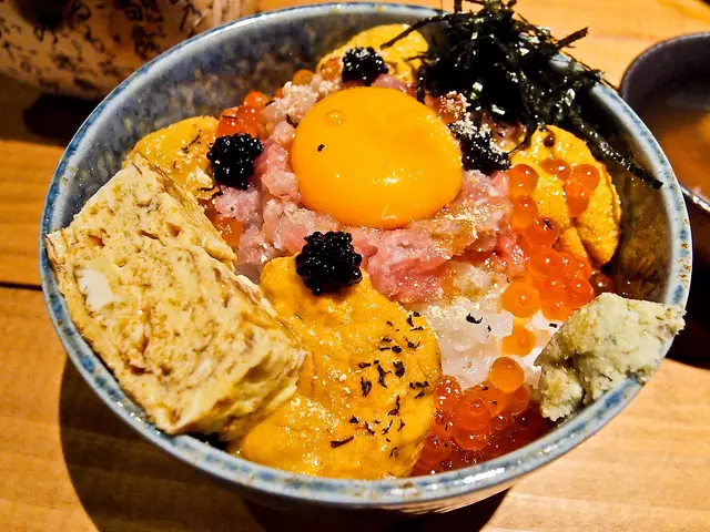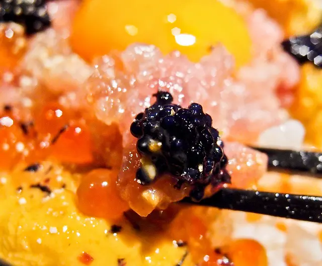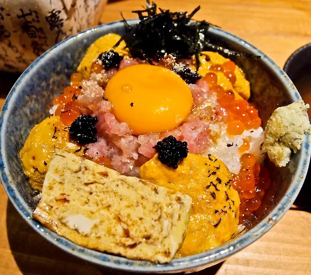 品質很不錯的鮪魚泥搭配生蛋黃,然後底下是很多的海膽加魚子醬。最下層則是新鮮好吃的軟絲與鮭魚卵
