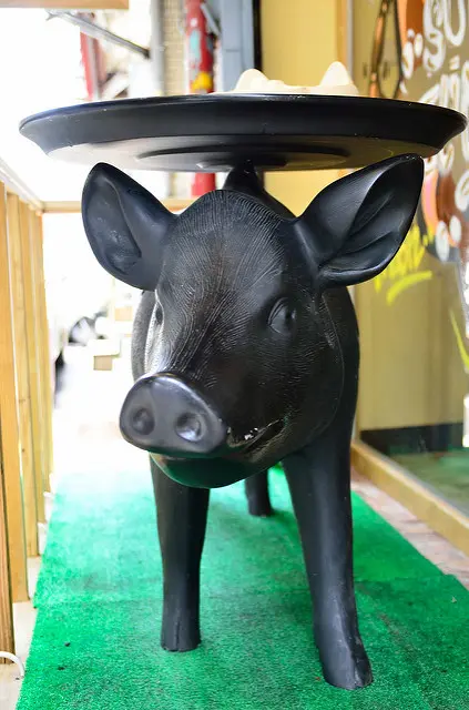 門口就有一隻可愛的小豬迎接客人~頭上還頂著盤子呢~!