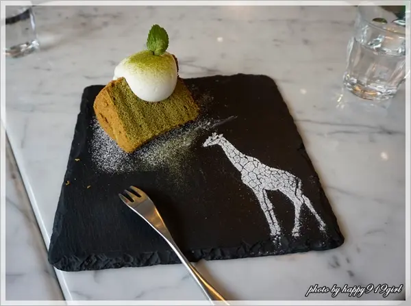 以黑色石板盤裝盛看起來似乎更有質感,再以糖粉撒上長頸鹿圖案作裝飾