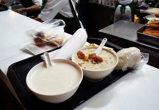 鹹豆漿(NT$30)一定要用熱的豆漿沖進去,讓白醋把豆漿變成花花的。