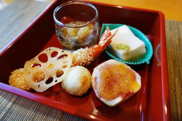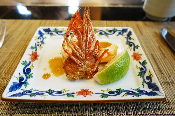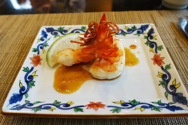 香格里拉日式鐵板燒的前菜相當清爽,本季節的前菜內容物有扎實的米果炸蝦、蓮藕片、球狀百荷根、綿密的糊麻豆腐配wasabi,玻璃甕中則是鮭魚卵、烤過香菇、蘿蔔泥......配上獨特醬汁真是好吃極了!!!