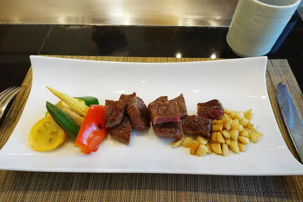 鐵板燒海陸套餐的價格差異不再海鮮而在牛肉,有三種可選:澳洲和牛莎朗 NT$2480、澳洲和牛肋眼 NT$2680、澳洲和牛菲力 NT$2780