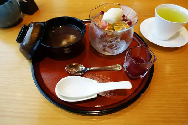 主要是溫熱的紅豆麻薯湯、配上一碗漂亮的冰品