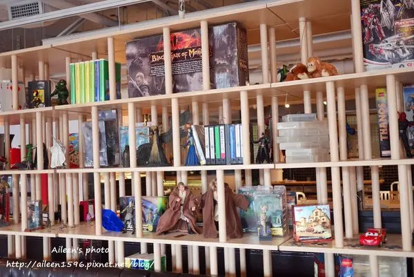 而另一個書架上就放滿了和電影有關的公仔,因為旁邊就是電影街。
