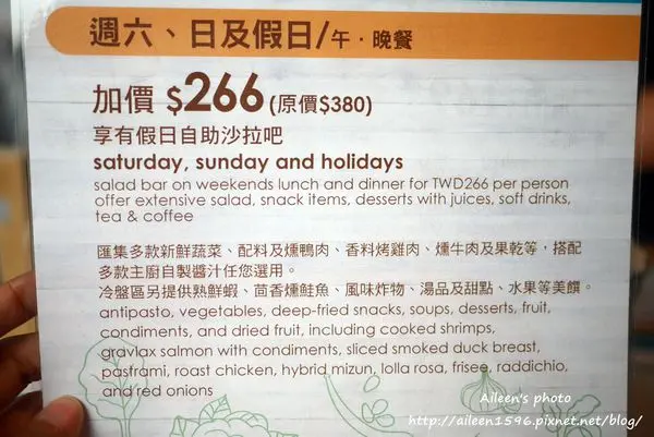 ((假日有自助沙拉吧提供,原價380元,主菜加價266元))