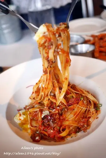 醬汁緊緊的巴在寬扁麵上,讓麵條吃起來超香、超Q彈的。((我很喜歡他們家的肉醬