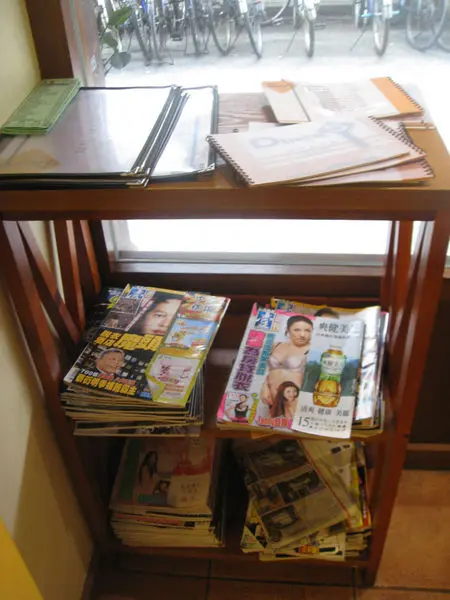 還有一個小檯子.上面有菜單和書報雜誌給客人看