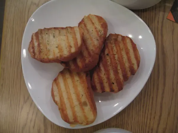 麵包表面烤的酥酥的.裡面吃起來很鬆軟.不過香蒜味不夠重.如果香蒜味可以重一點會更好.因為他們不是和一般在外面買的是用吐司去做的.所以口感也有所不同