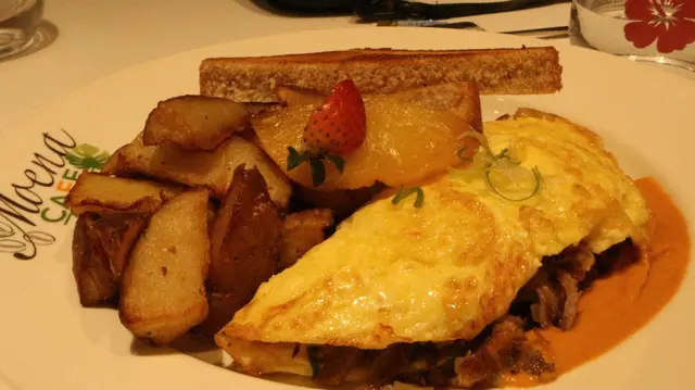 不要誤會,這可不是全日早餐,而是夏威夷奄列(台:歐娒)!厚厚的蛋包裹著煙燻豬肉,芝士跟洋蔥,像PIZZA風格的奄列,的確別有一番風味。