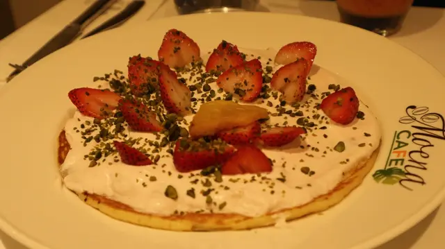 非常CREAMY,非常多CREAMY以及很甜,PANCAKE是很鬆軟,但如果加上那層厚厚的CREAM,可能比較適合女生吃吧!一顆顆的酸草莓起了調和的作用,味道跟草莓生日蛋糕很像