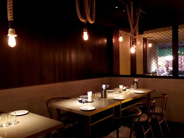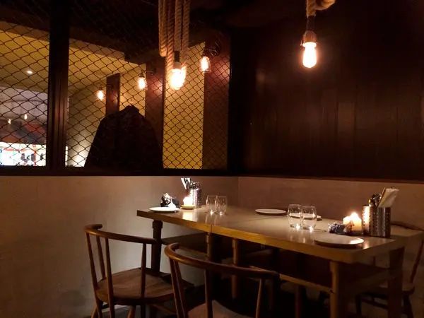 MUME 店內的燈光昏暗,多是用粗麻線繩繞著梁柱垂下,溫暖的黃光不會直接照射到頭頂或是臉,而是直接映在桌面上,所以雖然店內的燈光昏暗,菜色也能拍的非常清楚,這點我很喜歡,不僅因為拍照方便,我也喜歡在燈昏暗的地方用餐,這樣的視線是比較讓人放鬆的。