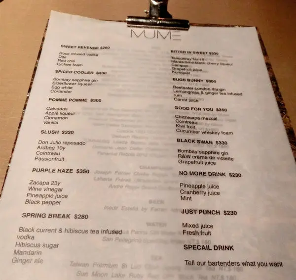 MUME 完整菜單 MENU 左邊是飲料/酒類,右邊才是食物類