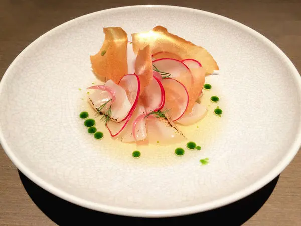 紅甘生魚片 KANPACHI CRUDO 菜單寫NT350+10%,但帳單實收是 NT330含服務費