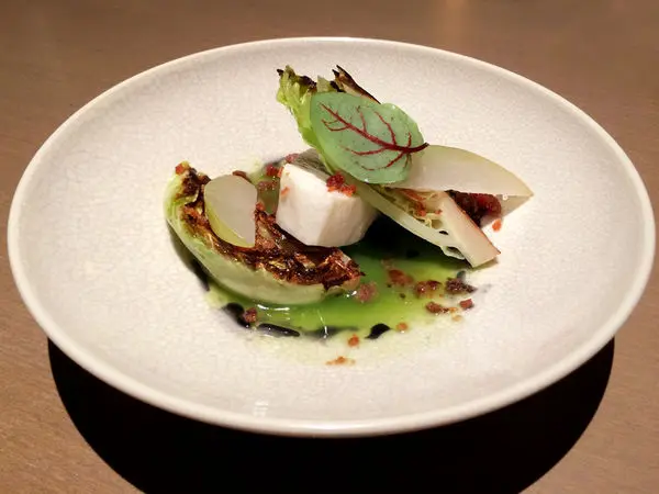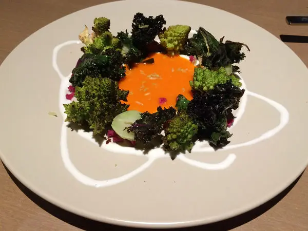 羅馬花椰菜 (寶塔花椰菜) 是台灣較少見的品種,不過我吃起來沒什麼特殊的感覺,其中還有甘藍,倒是最喜歡中央的胡蘿蔔奶油醬汁,真是太好吃了,最外層則是杏仁優格。