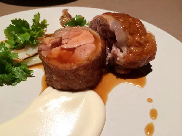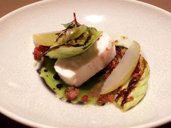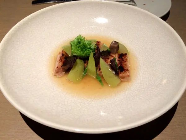 底部的湯汁有蘋果的清甜,綠色的是羅勒油,連帶干貝和蘿蔔都會有著無可挑剔的清香,覺得 MUME 主廚絕對是間很會運用水果在料理中的佼佼者