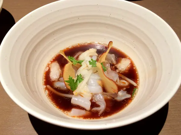 軟絲變成麵條狀很特殊,感覺真的很像在吃河粉之類的XDDD 底下蝦頭熬成的湯汁是偏重的口味,裡面還藏有比目魚,高湯偏鹹。