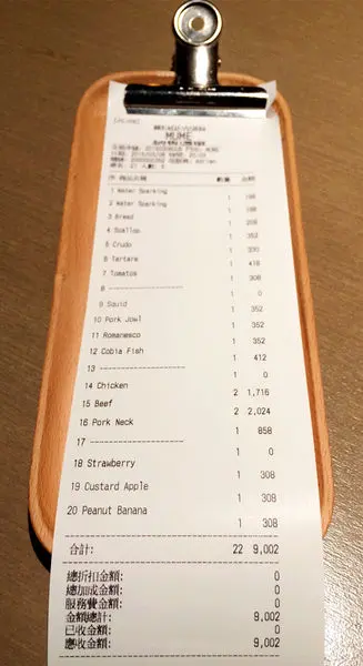 MUME 帳單每道菜都是已含服務費了,結果有道小菜不知為何店家少收了55塊XD 還是我因為我寫文章對照帳單才知道的~ 是人生中的小確性吧 哈哈哈 lol