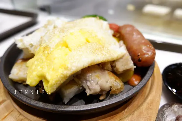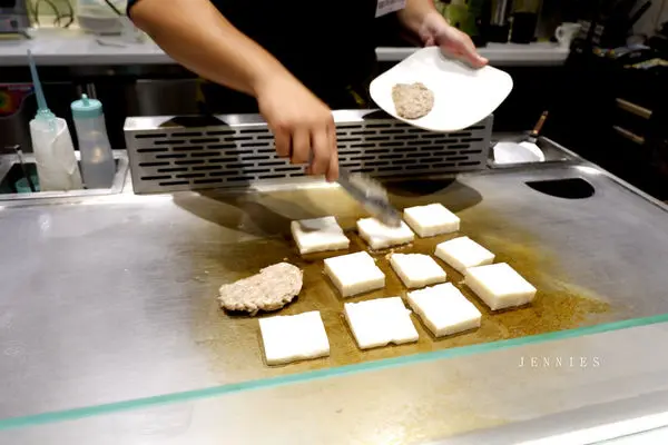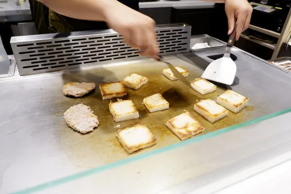 廚師把切好的蘿蔔糕一片一片放在鐵板上煎,還有芋粿巧;涼食帖原本販售一些涼菓、冰飲,現在也加入熱食。蘿蔔糕是台灣很常見的點心之一,也是中西式早點裡常出現的菜色,可以香煎也可以水蒸。通常製作蘿蔔糕的方式先以白蘿蔔切絲,混入在來米粉和栗米粉製成的粉漿,再加入蝦米、臘腸等材料,蘿蔔的產地跟產季也會影響其口感滋味。