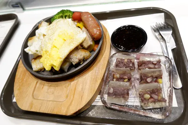 招牌雙拼NT160.(內容有芋粿巧/蘿蔔糕/蛋/香腸) 旁邊是紅豆小涼