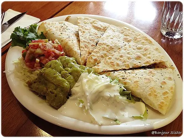墨西哥薄餅,蔬菜口味的,菜單中輕鬆單點系列,薄薄的餅皮,配上重口味的餡料蘑菇、蔬菜等,好吃。旁邊的塔塔醬一起吃也很爽口,綠色的應該是酪梨醬,我們本身不是很愛酪梨,所以還OK。