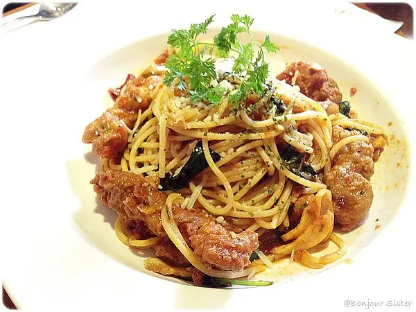 椒麻雞柳義大利麵,也算是重口味的一道料理,麵條還蠻入味的,雞柳也不小塊,怕辣的人可能不太適合喔