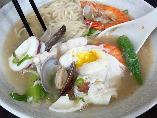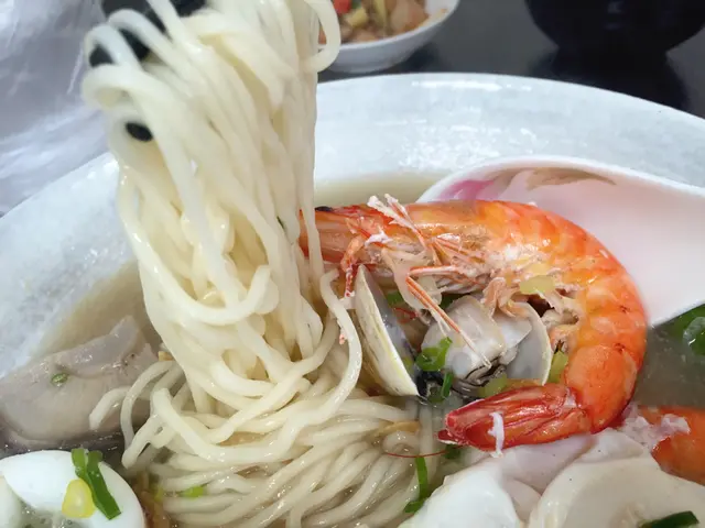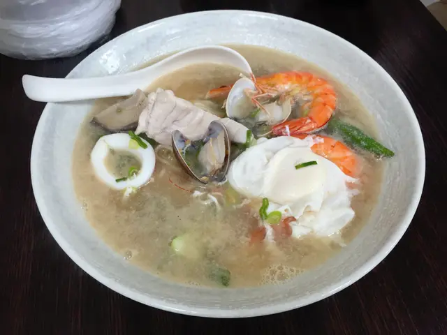 招牌主角海鮮拉麵,光看就讓人覺得口水直流,有蝦、蛤礪、魚肉片、花枝、香菇、秋葵、半熟蛋、青菜等超多豐富配料。