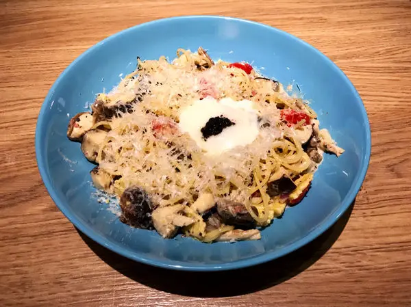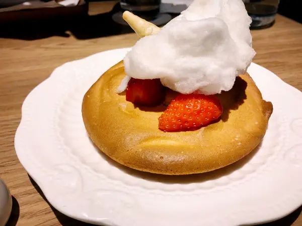 我們兩個都是第一次來,服務生還先幫我們介紹一下餐點,所以我們決定先點一個鹹的、一個甜的,再一人一杯飲料吃吃看囉!松露女兒紅卡波那義大利麵是看了菜單的介紹覺得應該不錯就點了,而且是永康店限定的。上面滿滿的起司本來還怕是會很濃厚的起司味,結果吃起來一點都不膩,配料蠻多的,味道不算重,上面一顆半熟蛋和松露醬,和醬汁攪拌著麵,吃起來很入味,雖然不是重口味,卻也吃起來很順口,算是好吃的義大利麵。