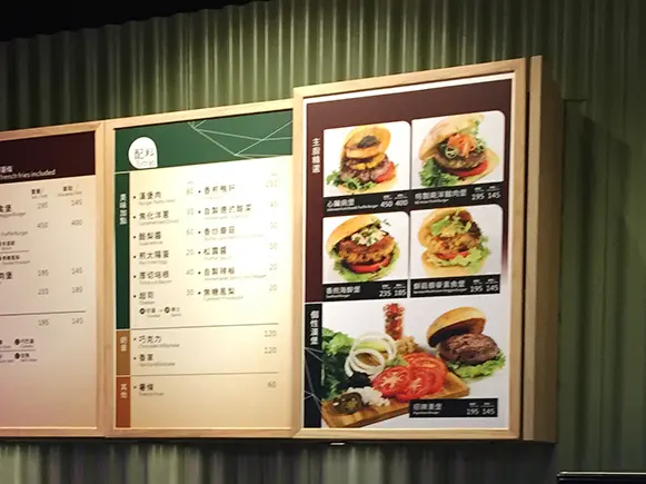 在櫃檯點餐,共有四種精選漢堡和個性漢堡,還有多種配料可以加點。