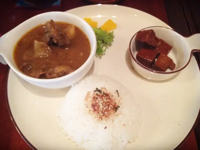 蘋果咖哩牛腩飯,偏日式的咖哩是我喜歡的口味,牛腩軟硬適中有口感卻不會難咬,也是一道下飯的菜。