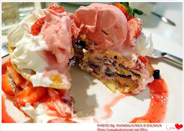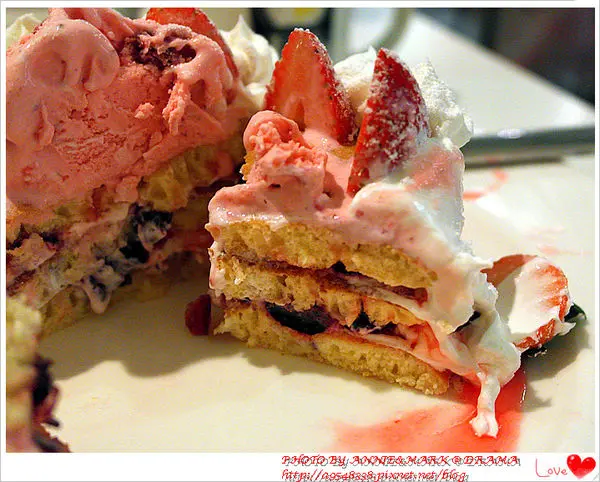 進口的草莓和野莓的微酸剛好中和了奶油的油膩感,溫熱的鬆餅配上冰冰涼涼的冰淇淋,