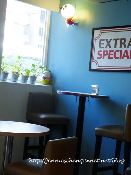 倒不是因為LOCOFOOD不好吃,因為我們不住這附近,老娘我今天可是專程來吃的捏!話說點完餐後走進後方的店內感覺頗好的,我喜歡店內的設計,一整棟的Tiffany藍,連紙杯墊及飲料的杯子都是,覺得會是家女生都喜歡的店喔!