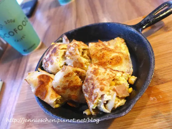 煎的焦香的樂口捲,足足讓我等了二十幾分鐘(比我晚到點一樣的都上桌了>"<),生日的早晨若要為此破壞心情可不值得呀!裡面有生菜、玉米及火腿攪拌在其中,但我吃起來覺得普通耶!如果他用的是莎莎醬我想可能會提升不少美味度喔!