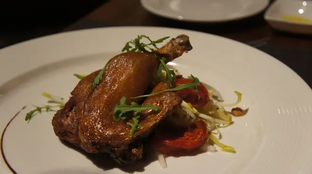 商業午餐-乾式熟成21天鴨腿襯萵苣蘋果沙拉,NT1280元。鴨皮煎得很酥脆,但又保有相當的油脂。鴨肉很juicy,圖片中的鴨腿因為鴨油而閃閃發光~一旁的蘋果萵苣莎拉,和鴨油馥郁的鴨腿真是絕配,清爽香甜、去油解膩。