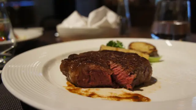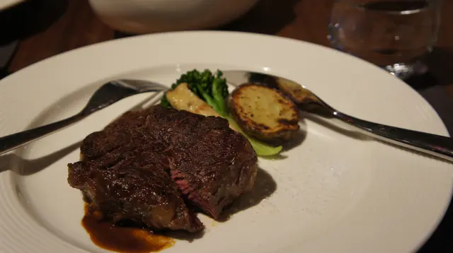 很棒的是這裡的牛排看起來雖然紅通通的但完全沒有血水,肋眼心一角的油花豐腴,肉質細緻鮮甜,每一口都是滿足。只要沾海鹽就很足夠。這個肋眼心並不是美福的乾式熟成牛排,乾式熟成牛排因為熟成的過程會耗損不少肉,所以都會以大盎司供應,最少16oz起跳,適合多人分食的形式。隔壁桌有點乾式熟成,除了牛排很大塊之外,那個外層的焦香我坐隔壁都聞到了...