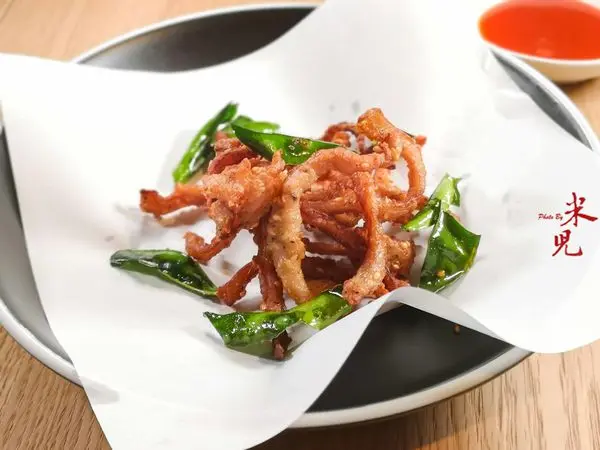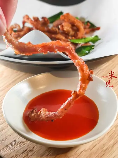 脆炸豬肉條,320大洋,分量少少的一道,將里肌與松阪豬肉以手工修整成細長肉條狀,醃製好之後冷凍起來,要出菜時才取出油炸,鹹香爽脆,沾著帶辣的醬汁一起吃還滿順口的,這道菜更像是下酒用的菜。