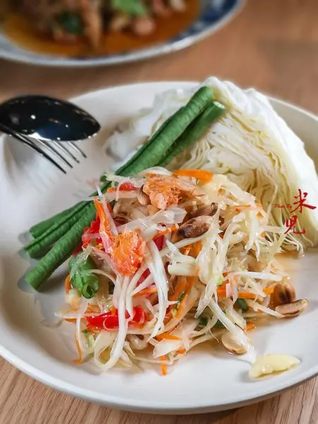 泰式青木瓜沙拉,280大洋。強調把泰國原汁原味搬來台北,所以這裡的涼拌青木瓜的辣度很足,我吃一口就投降了,但嗜辣的朋友卻可以抱著它自己嗑完一盤(膜拜~~)