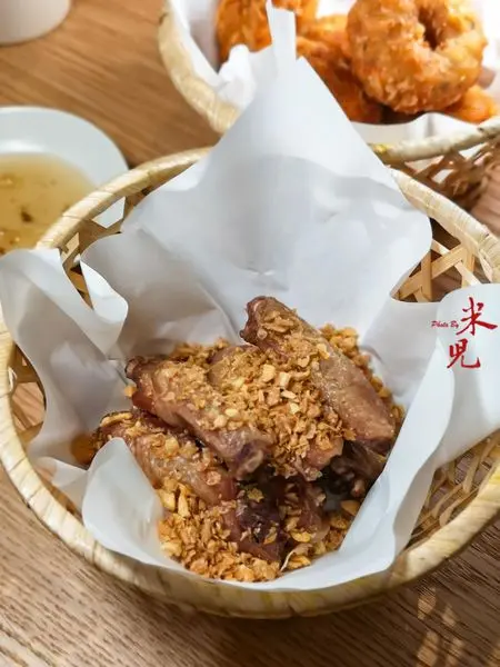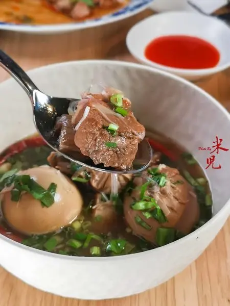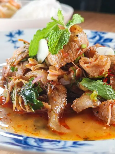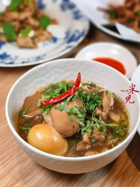 泰式酸辣滷肉,320大洋。這道菜使用了五花肉、里肌、帶軟骨的腩排與帶骨的子排四個部位的豬肉,與椰糖、醬油、香菜根、蒜頭、泰國五香粉一起滷製,並加入南薑、香茅、檸檬葉、辣椒、美國香菜....等等。