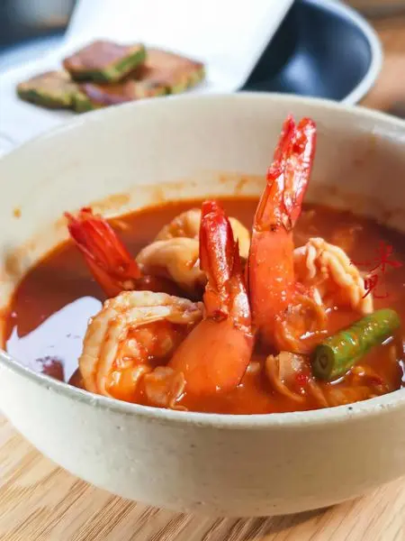 酸辣海鮮湯,480大洋。這裡的冬蔭功是泰國傳統做法,不是湯而是「湯菜」,加了自己炒的紅咖哩及各式香料製作而成,主要是用來配飯吃的。上桌時還搭配了蔬菜還是香料煎蛋,也和印象中的吃法很不一樣。不過蝦子吃起來有點老,而且真的滿辣的,如果想喝湯的人千萬別點這道。