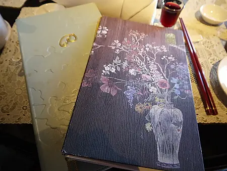 紫色很漂亮的那本是菜單 底下素雅綠灰色的是飲料單